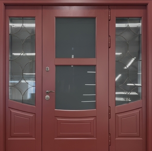 Остекленная входная группа с терморазрывом, ковкой по бокам и панелями МДФ с покраской эмалью сочетает в себе прочность и изысканный внешний вид. МДФ-панели имеют высокую устойчивость к износу и деформации. Гармонируют с цветовой палитрой фасада и внутренней отделки. Отделка легко впишется в любой интерьер, а цветовая гамма подчеркнёт стиль помещения.