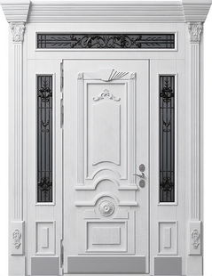 Парадная входная группа с терморазрывом, капителями, отбойниками, ковкой, стеклами и белыми панелями МДФ с резьбой — это практичное решение для тех, кто ищет баланс между эстетикой и надёжностью. Панели из МДФ доступны в широкой палитре цветов и текстур, включая имитацию ценных пород древесины. Служат выразительным элементом композиции входа. Оформление делает дверь не только функциональной, но и визуально привлекательной.