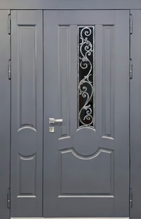 Полуторная входная термодверь с узким стеклом и ковкой, отделкой МДФ цвета графит КД-1383
