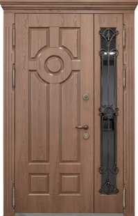 Утепленная полуторная термодверь с карнизом, ковкой, стеклом и шпонированными панелями МДФ КД-1388