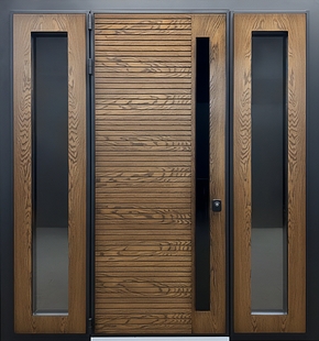 Входная группа с терморазрывом, стеклами по бокам, МДФ со шпоном, бугельной ручкой — подойдёт тем, кто ценит качество и выразительный дизайн. МДФ-панели сочетаются с любыми архитектурными стилями — от классики до модерна. Подходят для оформления в стиле минимализм, лофт или модерн. Оформление подойдет для частных домов с кирпичной и деревянной облицовкой.